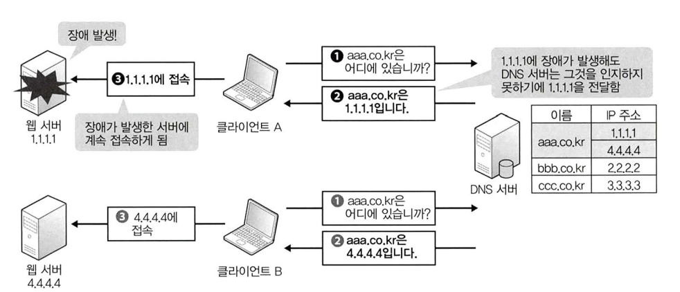 - DNS 서버는 장애가 발생한 사실을 알 수 없기 때문에, 다운된 서버로 접속 시도하게 됨