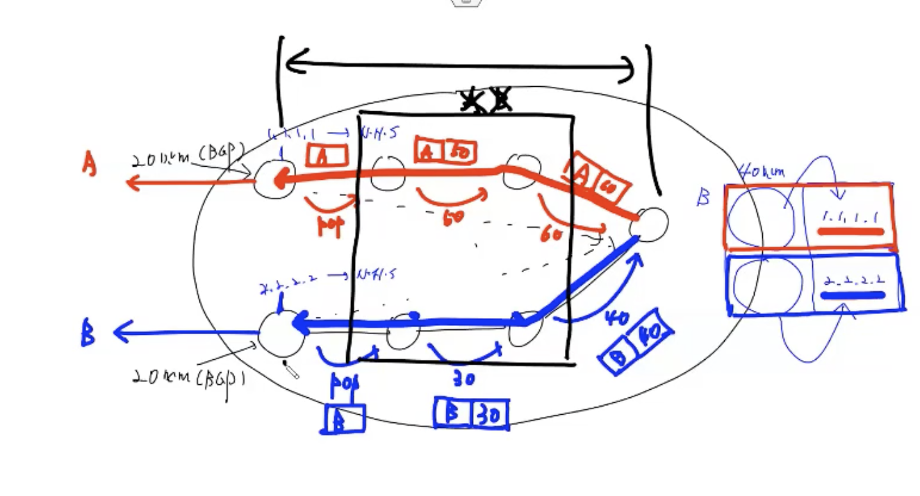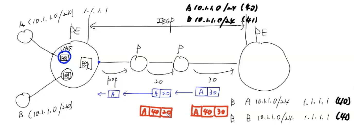 - 전용회선 처럼 쓰기 때문에, 다른 고객끼리 같은 ip를 사용할 수 있음. 그래서 VRF를 만듦. (A, B 고객) A 고객의 정보는 label 정보를 40, B 고객의 정보는 label 정보를 41로 퍼뜨림. 그리고 PE1은 해당 40, 41 레이블로 들어오면 어느쪽으로 나갈 수 있는지 앎.