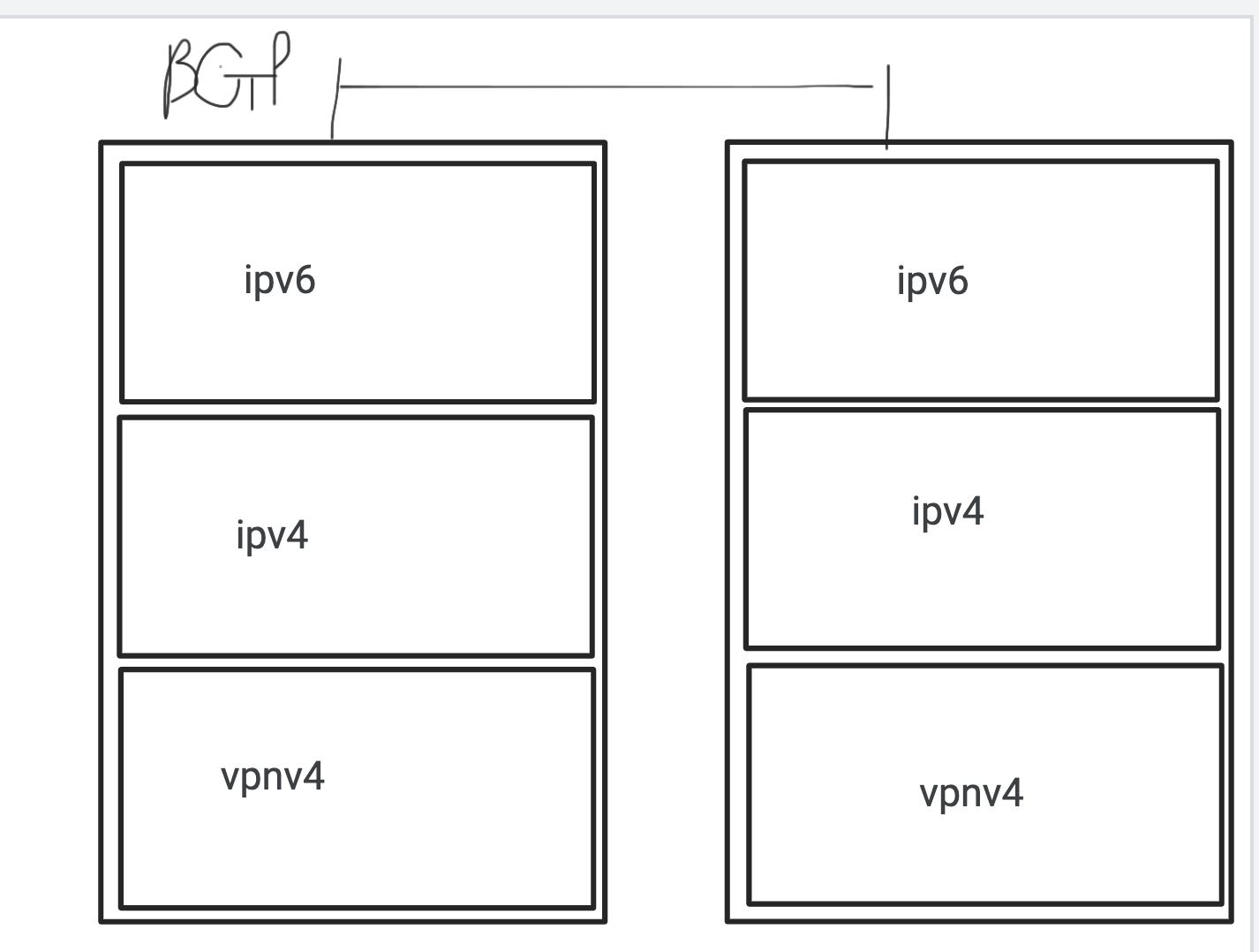 - BGP 테이블에서 ipv4, ipv6, vpnv4 각각 데이터베이스를 가지고 있으면, 같은 Neighbor랑 연결이 되어있을 때, 세션은 하나의 bgp 를 통해 전달을 하게됨