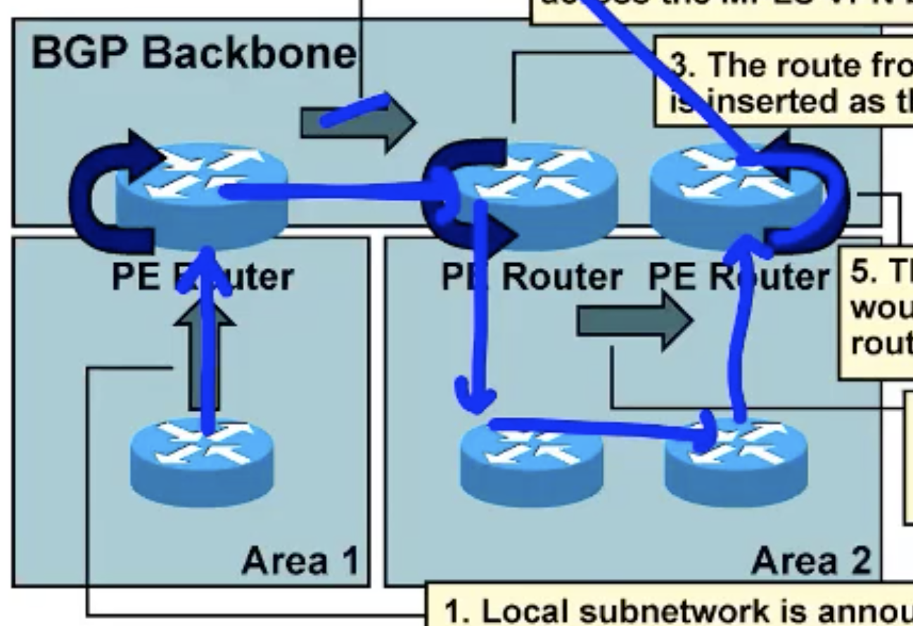 그래서 pe-ce가 연결된 구간에서 ospf를 돌릴 때, 그 사이에 area 0이 아닌 다른 area가 있다면 bgp로 넘어가지 않음.