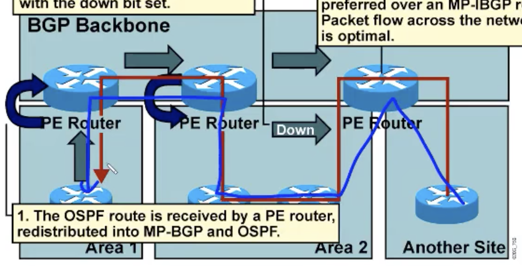 (OSPF로 받아서 MP-BGP로 넘어간 애들에 대해서 )MP-BGP에서 OSPF로 redistribute하는 네트워크에 대해서는 down bit를 세팅을 함.