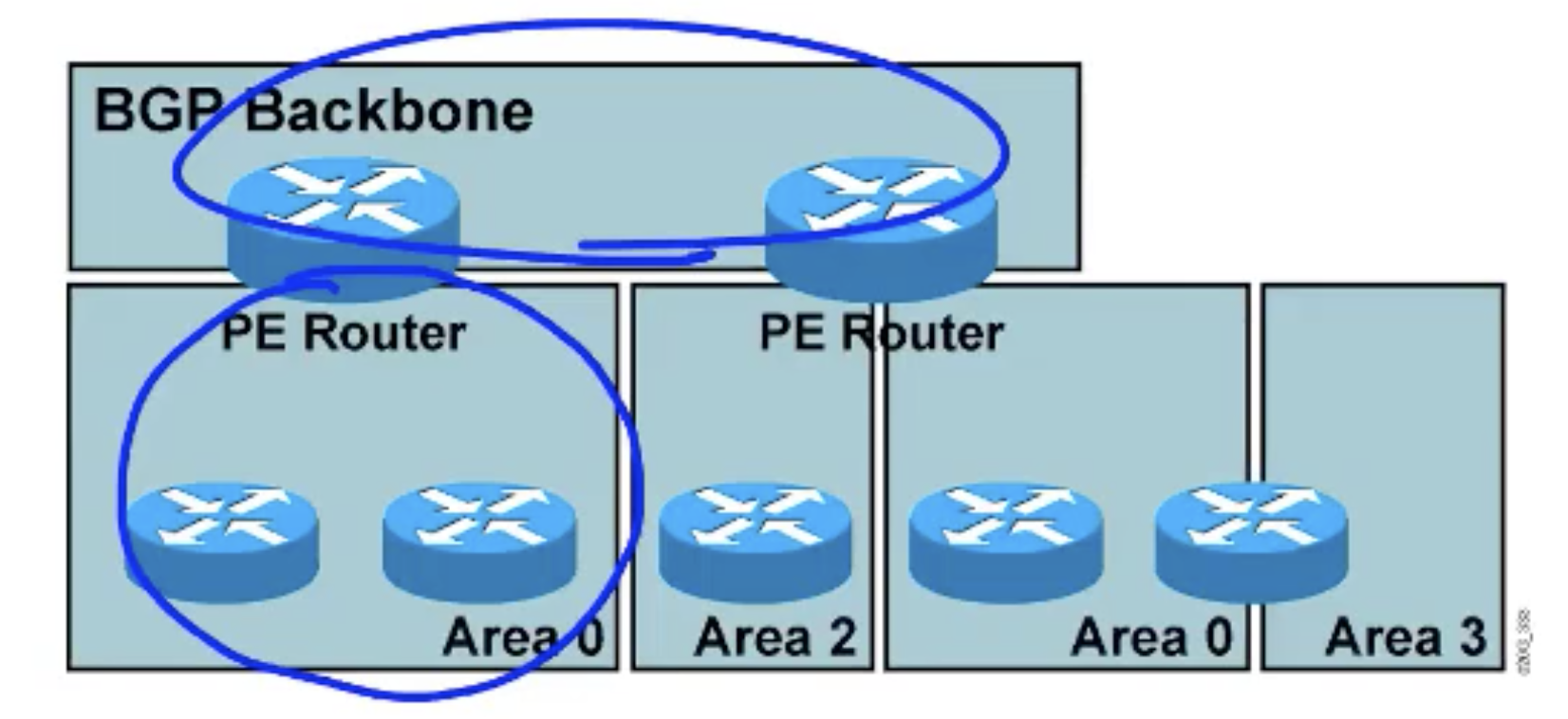 그래서 pe-ce가 연결된 구간에서 ospf를 돌릴 때, 그 사이에 area 0이 아닌 다른 area가 있다면 bgp로 넘어가지 않음.