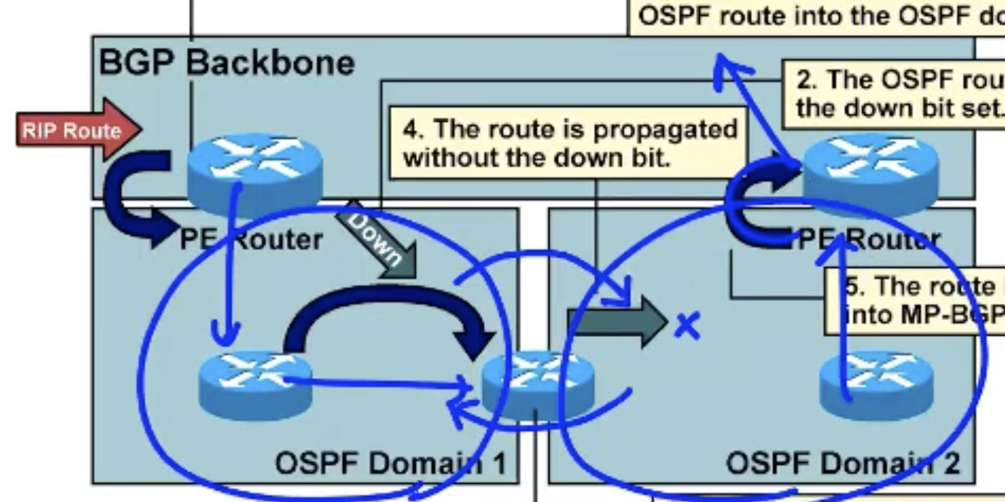 (OSPF로 받아서 MP-BGP로 넘어간 애들에 대해서 )MP-BGP에서 OSPF로 redistribute하는 네트워크에 대해서는 down bit를 세팅을 함.