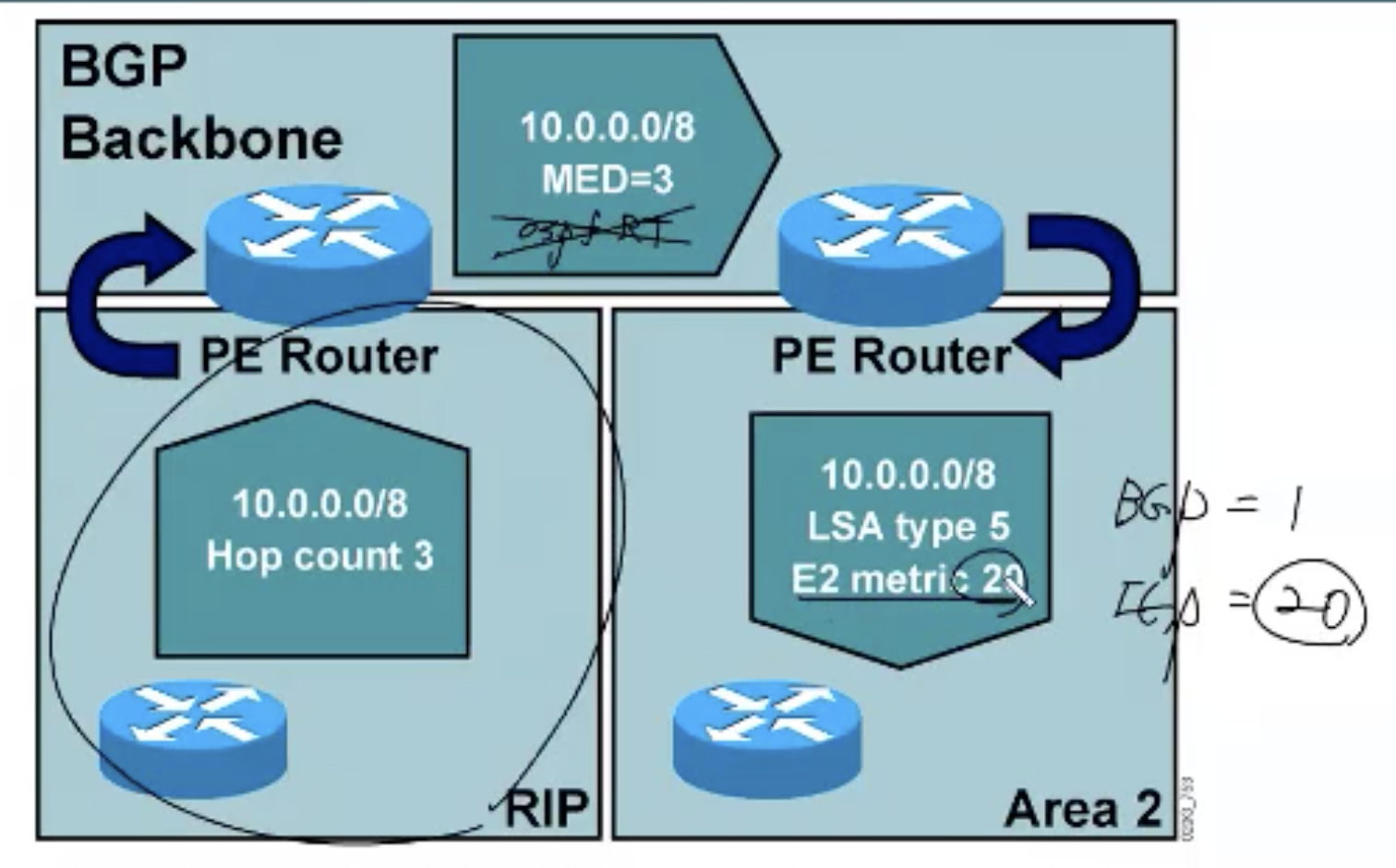 그런데 OSPF로 받은 값은 admin distance 값이 110, BGP로 받은 정보는 200이기 때문에 트래픽이 그림의 파란색 선 처럼 mpls만 타지 않고 꺾일 수 있음.