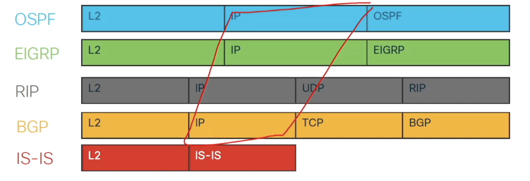- Is-Is : 다이렉트로 붙어 있는 애와 통신하는 것이기 때문에 l3 header가 필요하지 않음.