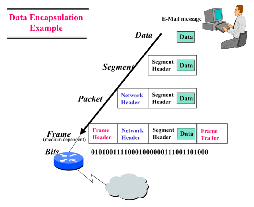 encapsulation : 각 layer에서 data부분의 앞에 header( and 뒤에 trailer )들을 배치하는 것