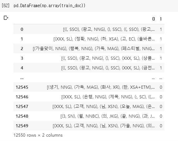 train_doc = [ ( tokenizer.pos(x), y ) for x, y in tqdm( zip( train_xx['text'], train_yyy['smishing'] ) ) ] # Mecab를 활용하여 text를 토큰화 시킴