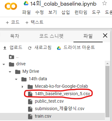 submission.to_csv("14th_baseline_version_5.csv",index=False) #현재 결과물인 output2를 구글 드라이브에 submission_test라는 이름으로 저장
