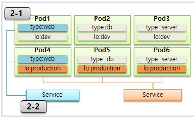 - type:web은 Pod1, Pod4에 있는데, 하나는 개발, 하나는 상용 환경에 있음