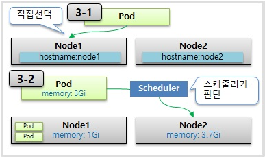 - 노드를 직접 선택하는 방법과 쿠버네티스가 정해주는 방법이 있음