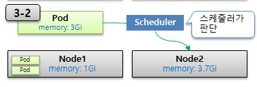 - 메모리를 예로 들면, 파드가 2GB 메모리를 요구하는 사용량을 설정하면 메모리 여유가 있는 Node2로 감
