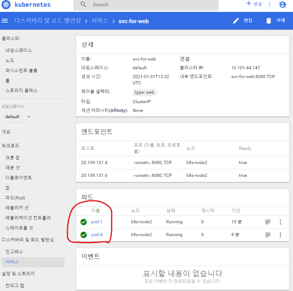 - type:web인 파드 2개 확인