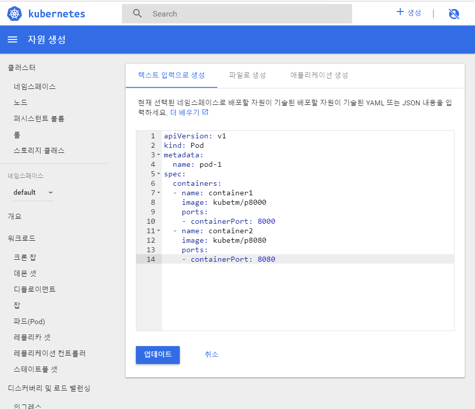 아래 YAML 복붙 후 업데이트 클릭