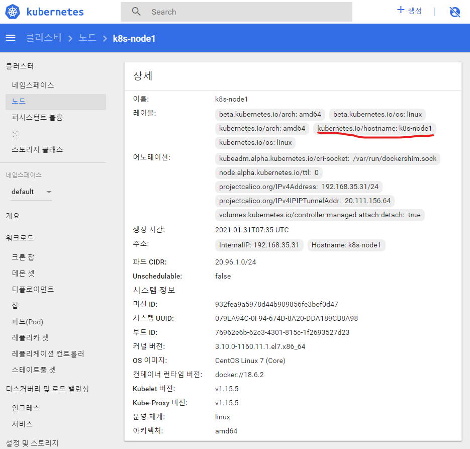 - 쿠버네티스(kubernets.io) 호스트(hostname)가 노드 1번(k8s-node1)을 가리킴