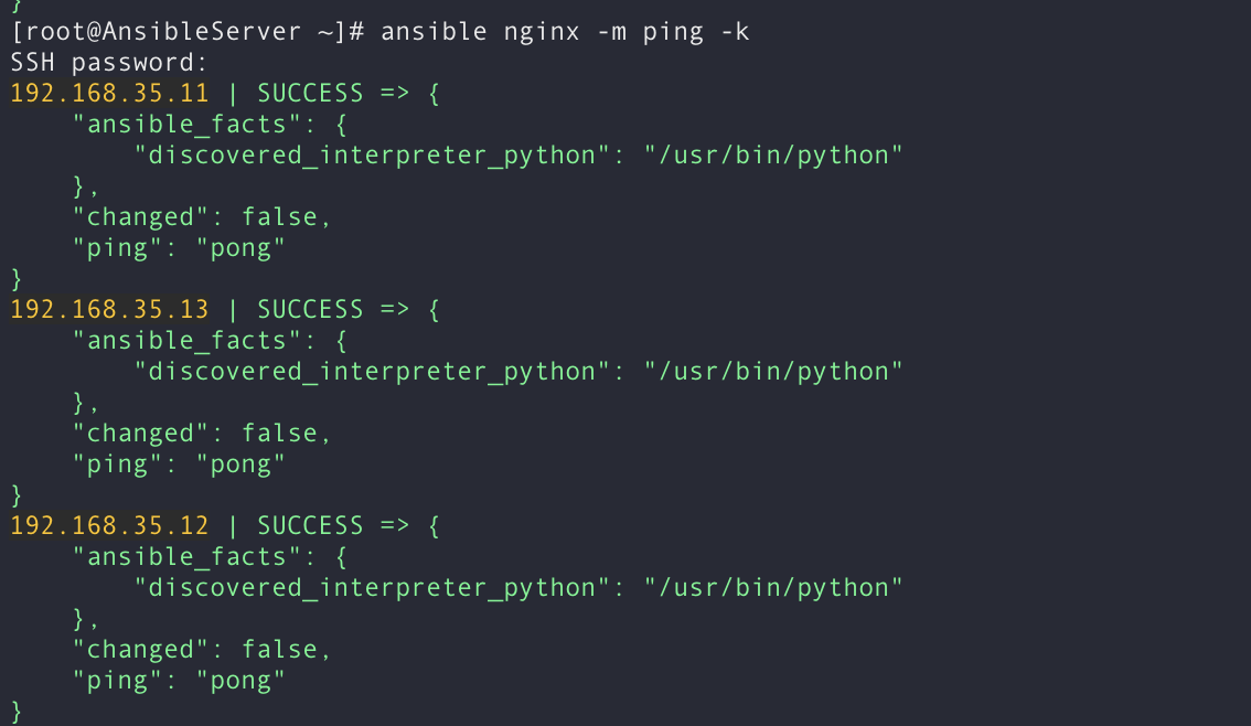 [root@AnsibleServer ~]# ansible nginx -m ping -k