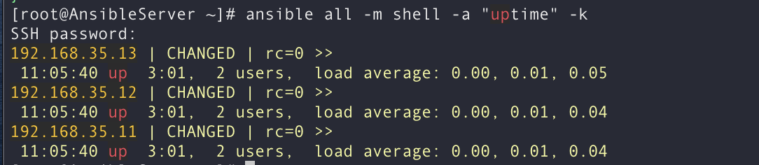 [root@AnsibleServer ~]# ansible all -m shell -a "uptime" -k