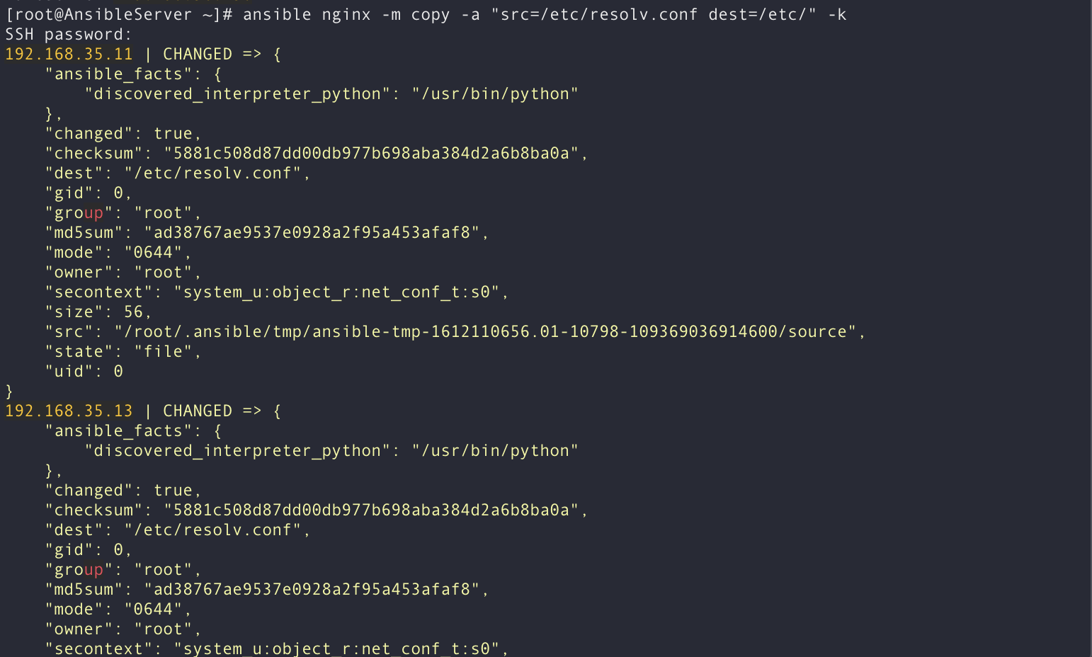 [root@AnsibleServer ~]# ansible nginx -m copy -a "src=/etc/resolv.conf dest=/etc/" -k