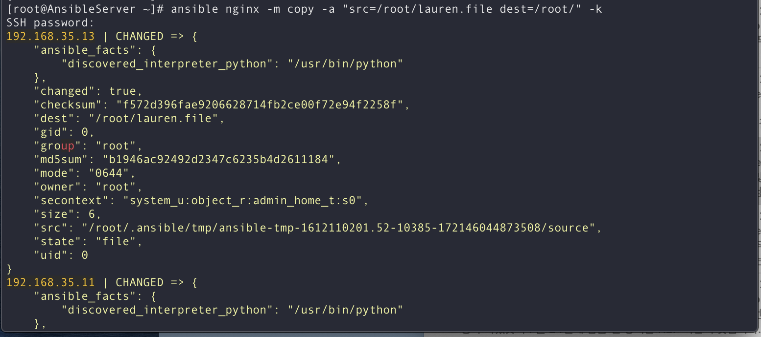 [root@AnsibleServer ~]# ansible nginx -m copy -a "src=/root/lauren.file dest=/root/" -k