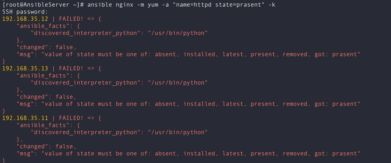 [root@AnsibleServer ~]# ansible nginx -m yum -a "name=httpd state=present" -k