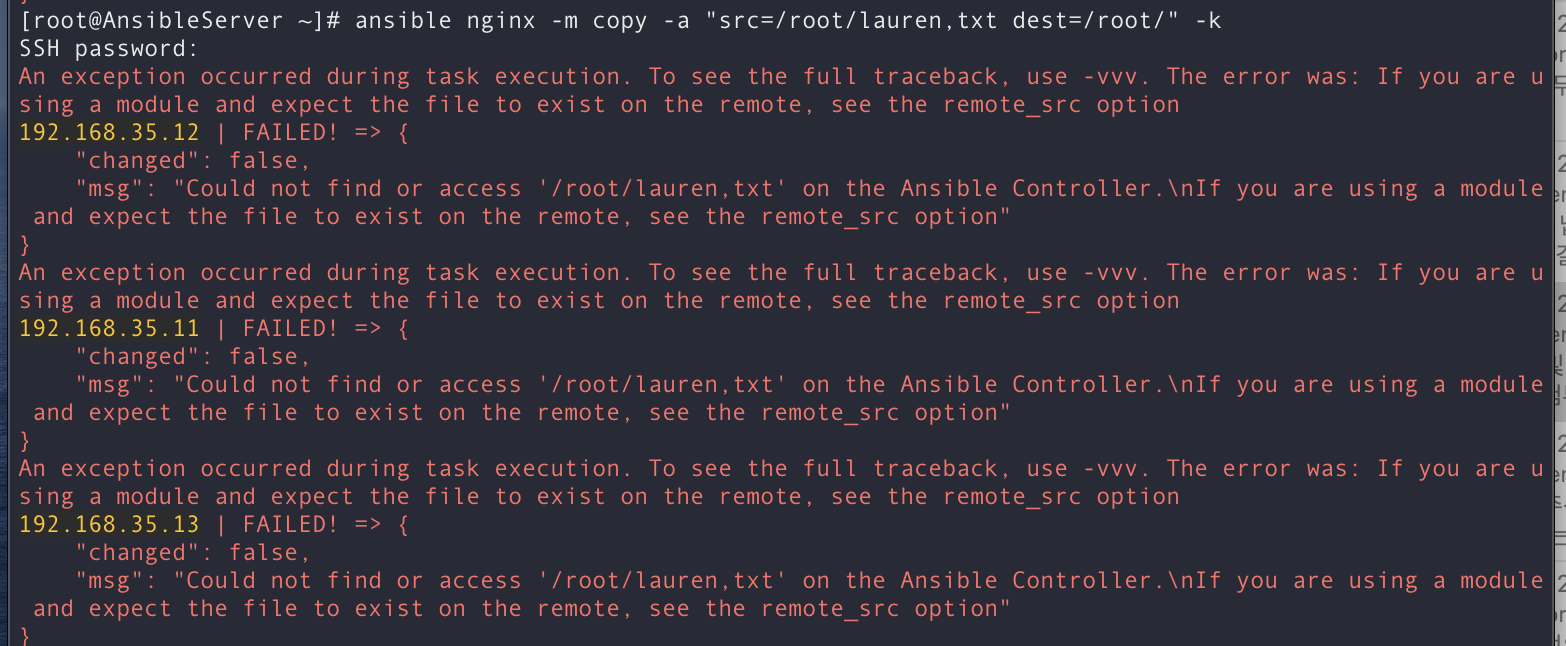 Could not find or access '/root/lauren,txt' on the Ansible Controller.\nIf you are using a module and expect the file to exist on the remote, see the remote_src option <-- 이런 에러가 뜸...
