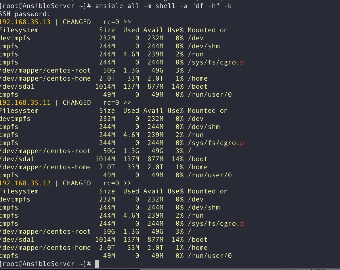 [root@AnsibleServer ~]# ansible all -m shell -a "df -h" -k