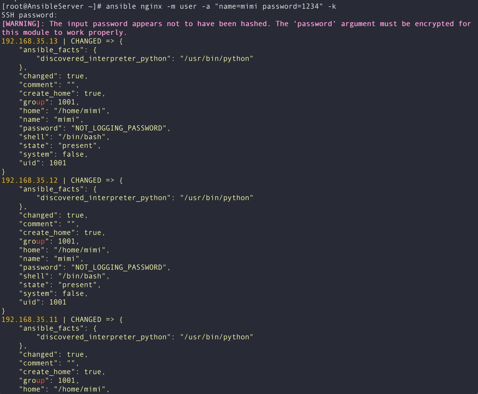 [root@AnsibleServer ~]# ansible nginx -m user -a "name=mimi password=1234" -k