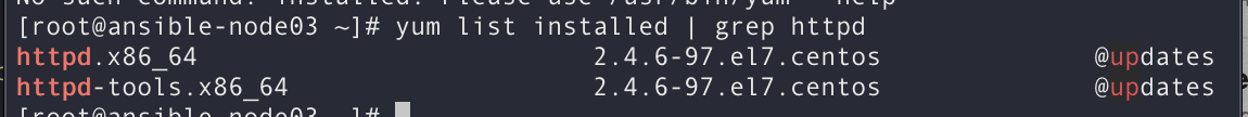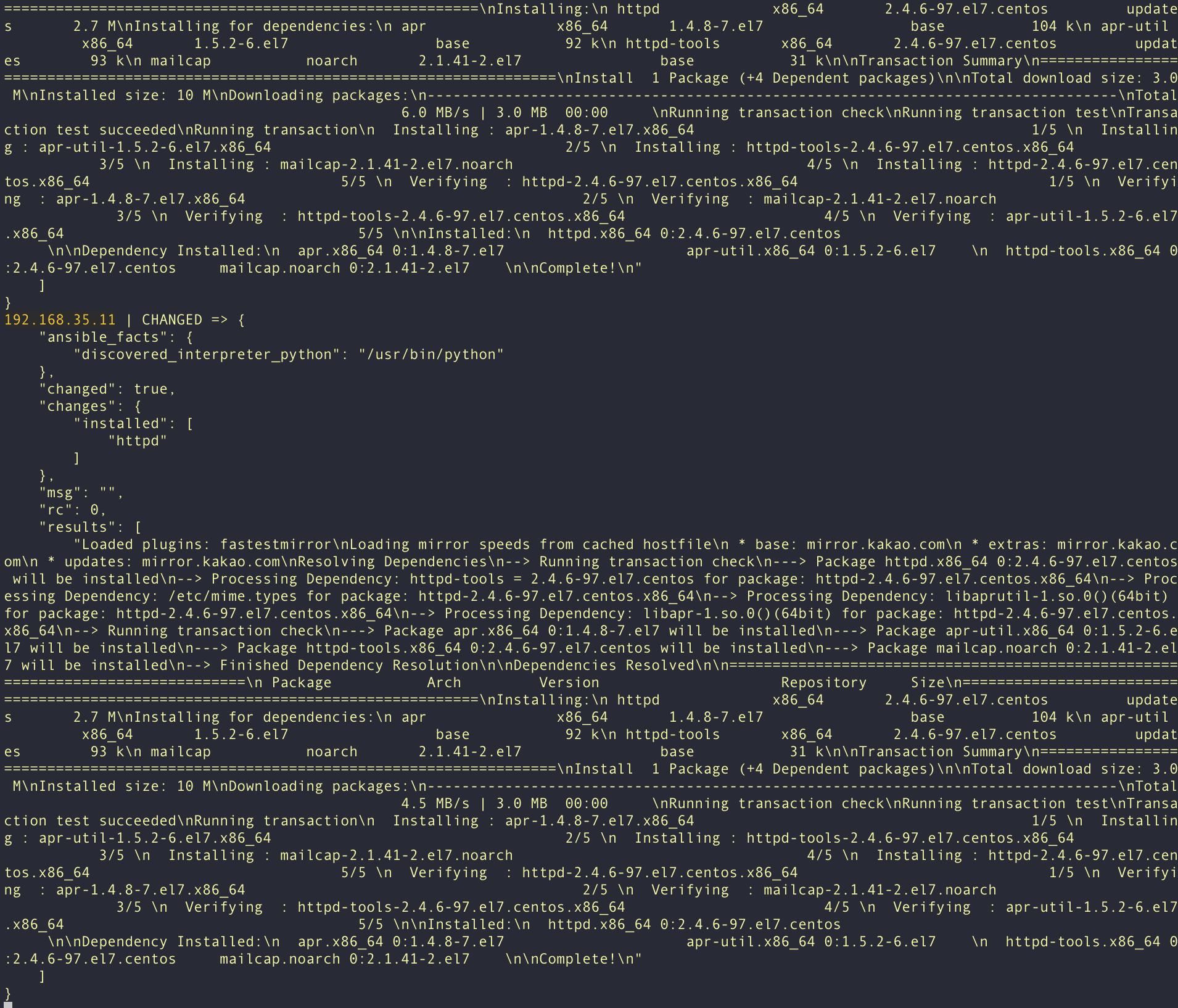 그 다음 다시 위의 명령어로 설치함(ansible nginx -m yum -a "name=httpd state=present" -k)