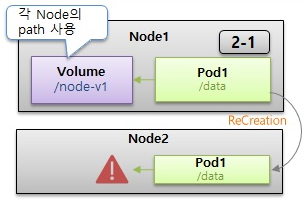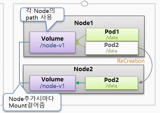 - 노드2가 생길 때, 똑같은 경로를 만들어서 노드에 있는 path끼리 마운트시켜주면 해결가능하지만 쿠버네티스가 해주는게 아님