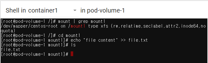 mount | grep mount1명령어로 mount1이 마운트됐는지 확인 cd mount1 && echo "file content" >> file.txt- ls로 파일 생성 확인