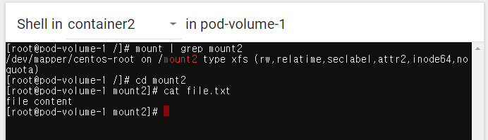 cd mount2 && ls명령어로 file.txt 존재 확인 cat file.txt로 내용도 확인- 당연히 pod 삭제하고 다시 만들면 내용 없어짐