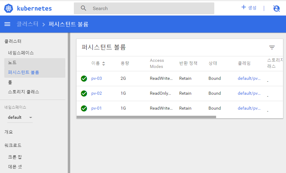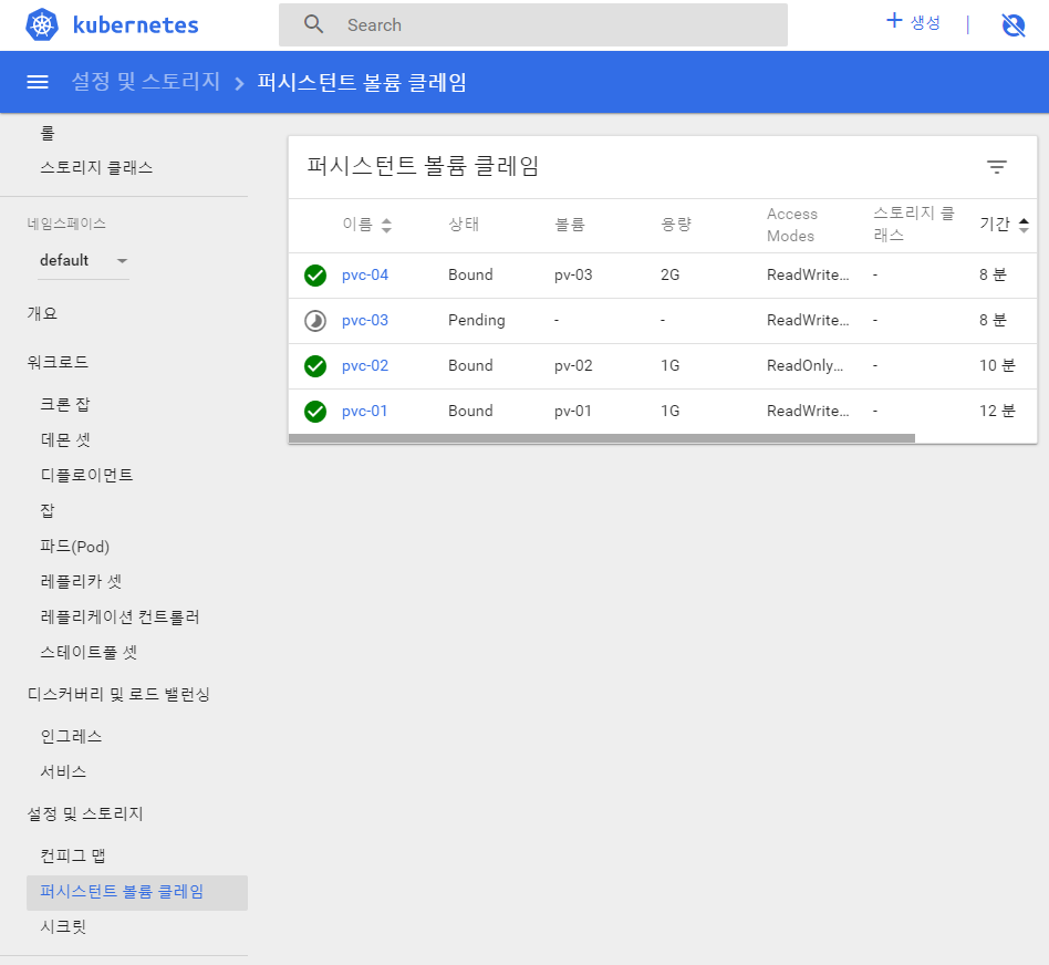 name: pvc-02,accessModes: ReadWriteOnce로 생성name: pvc-03,accessModes: ReadWriteOnce,storage: 3G로 생성 --> pending됨- 2G인데 3G를 요구하니 pending~