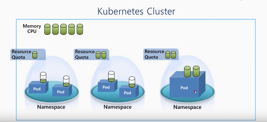 - 한 네임스페이스의 파드가 클러스터의 자원을 다 써버리면 다른 네임스페이스의 파드가 쓸 자원이 없는 문제 발생