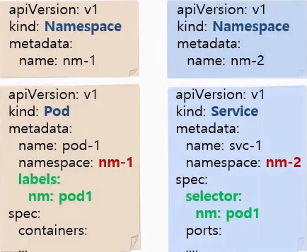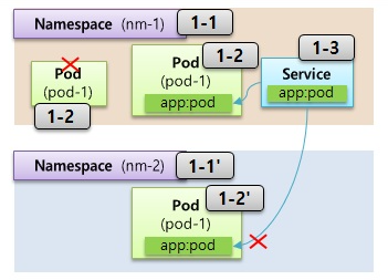 - 예시의 파드와 서비스는 네임스페이스가 서로 달라 라벨과 셀렉터의 nm이 같아도 연결되지 않음