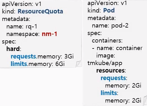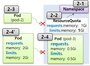 - 파드를 추가할 때, 파드의 Requests, limits가 ResourceQuota에 명시된 request와 limits를 초과하게 되면 파드를 만들 땐 만들어지지 않음