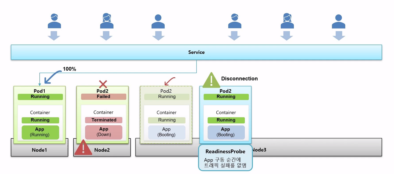 - ReadinessProbe는 앱이 구동되기 전까지 서비스와 연결이 되지 않도록 해줌