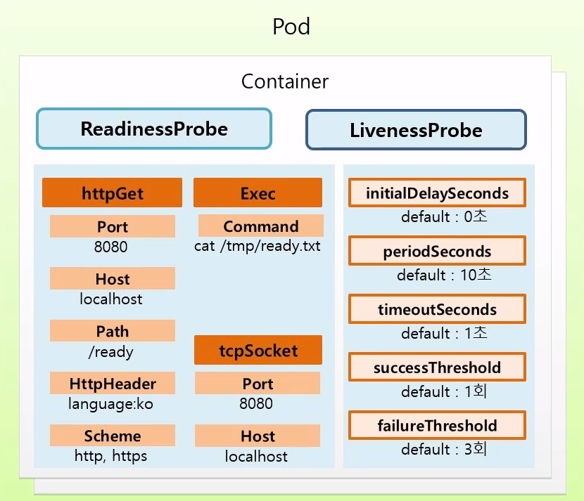 - httpGet: 포트, 호스트이름, Path, HttpHeader, Schme 확인 가능