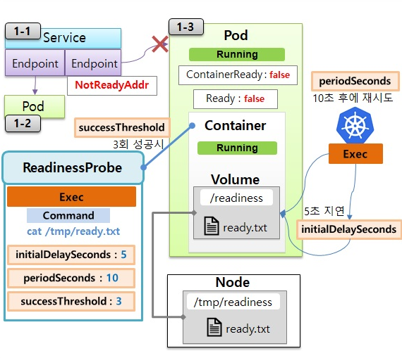 - 이 때, Node에 ready.txt가 추가되면, 컨테이너의 Volume과 연결되어 있어서 다음 ReadinessProbe는 성공