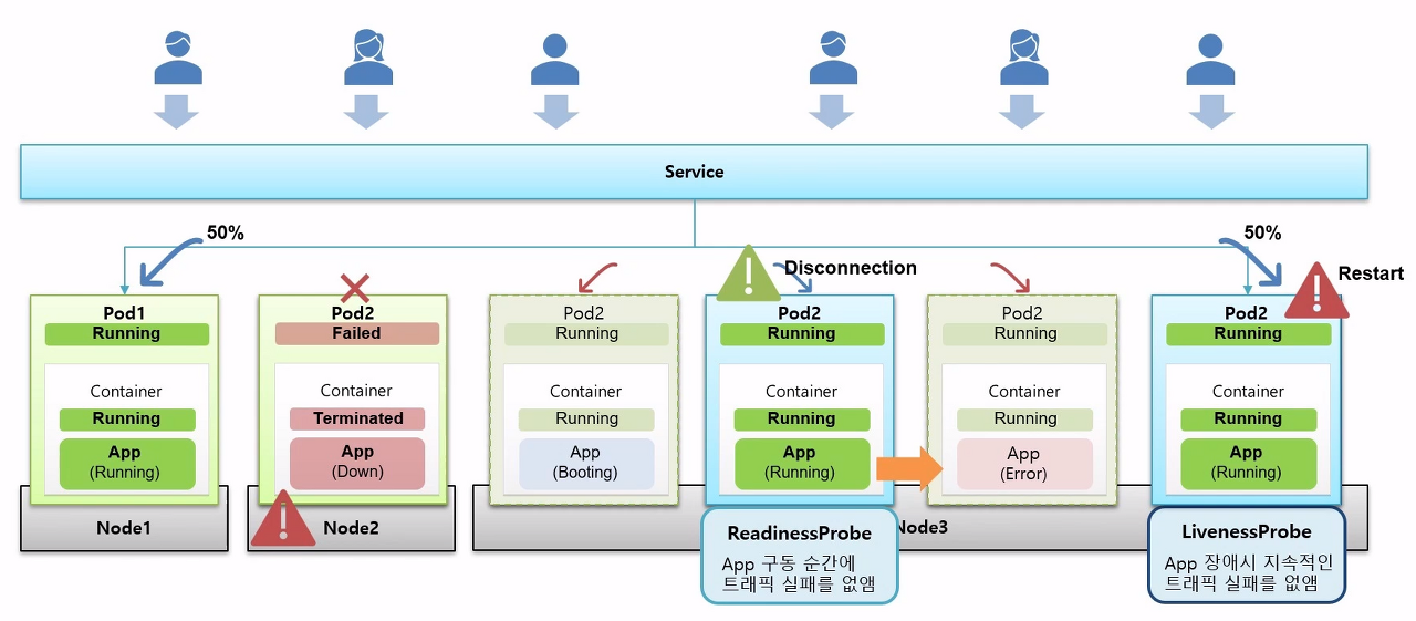 - LivenessProbe: 앱에 문제가 생기면 해당 파드를 다시 실행함