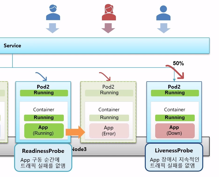 - 이 때, 트래픽이 파드2로 오게되면 사용자는 에러페이지를 보게 됨