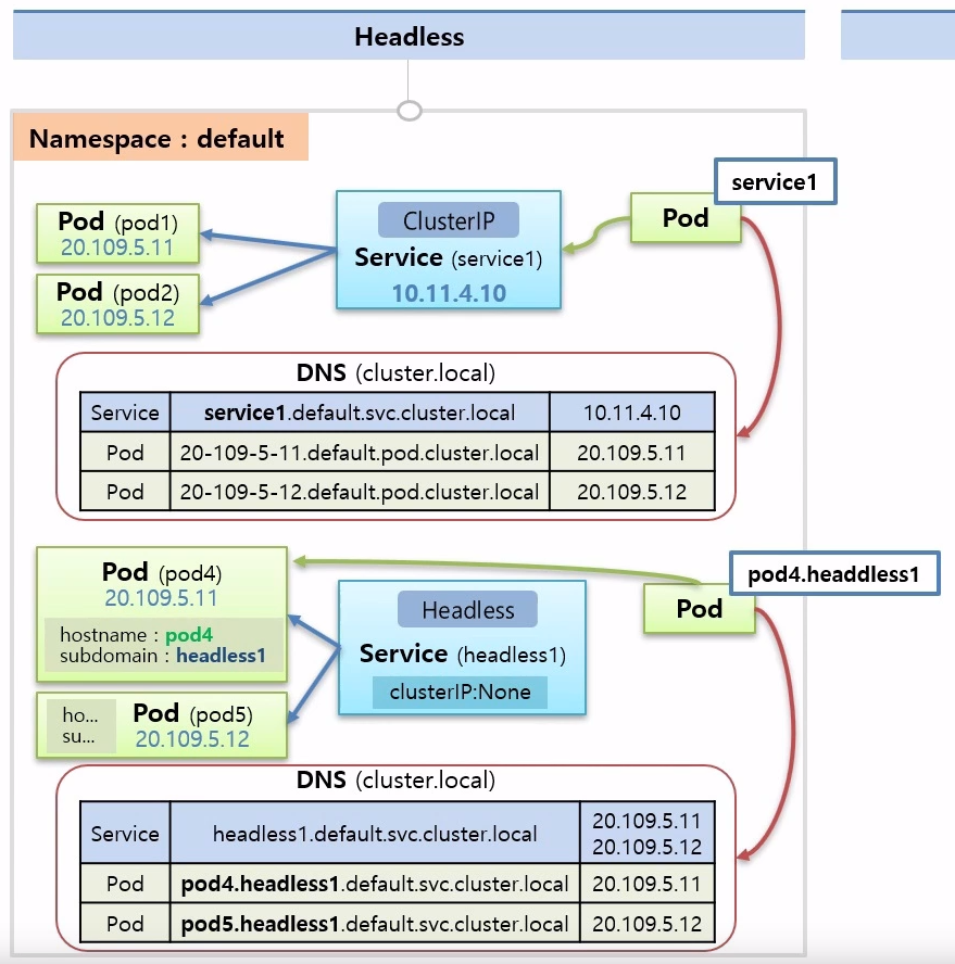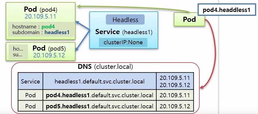 - 똑같은 상황에서 파드가 파드4에 직접 연결하고 싶으면 서비스를 Headless로 만들어야 함