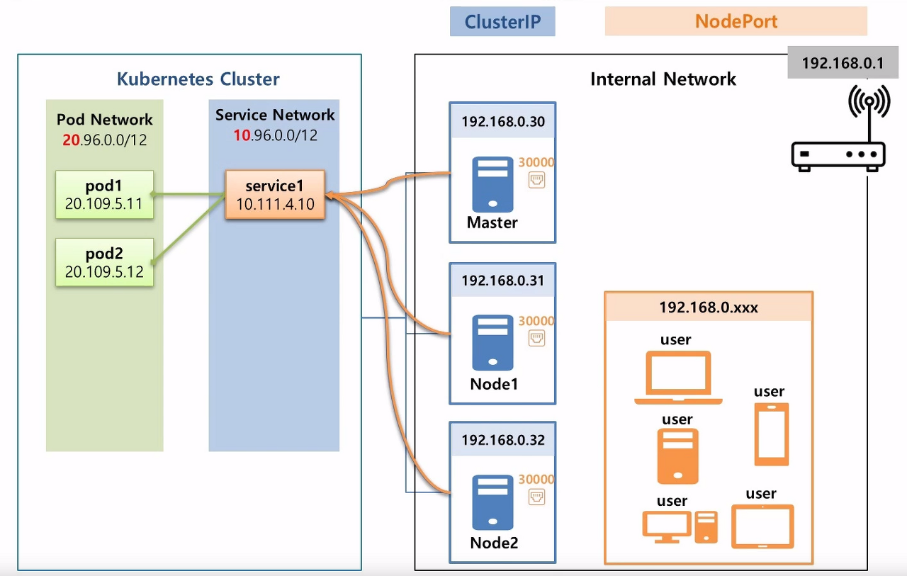 - 쿠버네티스 관리자는 내부망에 있는 사람들에게 세 대의 서버 중 하나의 아이피와 포트(30000)을 알려주면, 내부망에 있는 기기들이 서비스에 접근 가능해짐