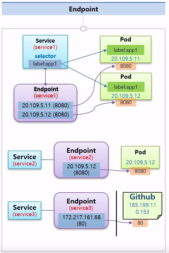 - 이 때, Endpoint에 파드의 아이피가 아니라 외부의 아이피 주소를 넣을 수도 있음(근데 그림에서 service3의 아이피는 이상한데....)