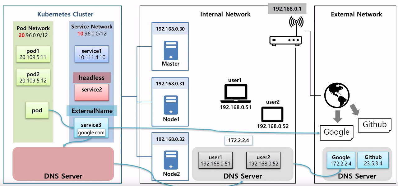 - 외부에 있는 사이트도 도메인 이름이 외부 DNS에 등록되어 있기 때문에 pod가 Google을 찾으면