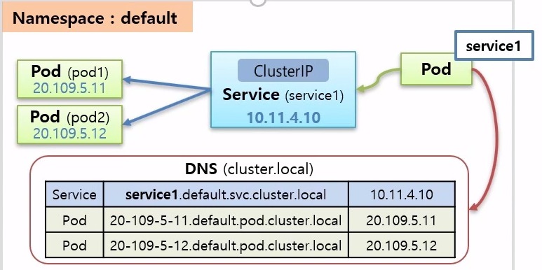 - pod가 service1에 대한 도메인 이름을 질의하면 해당 아이피를 알려줌
