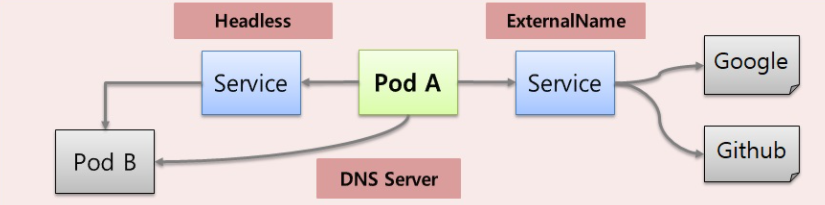 - ExternalName service3에 google 도메인 이름을 넣으면 DNS를 타고 타서 Google 아이피를 가져올 수 있음