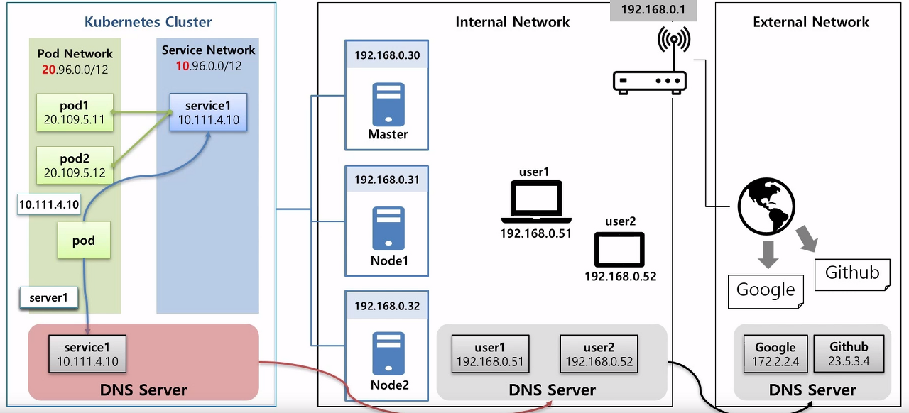 1. pod는 service1, 내부망 user, 외부망 Google에 접속하고 싶어 → DNS Server