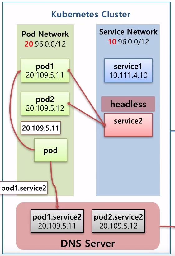 - 이처럼 pod가 접속하고자 하는 아이피를 몰라도 DNS를 통해서 아이피를 알 수 있음