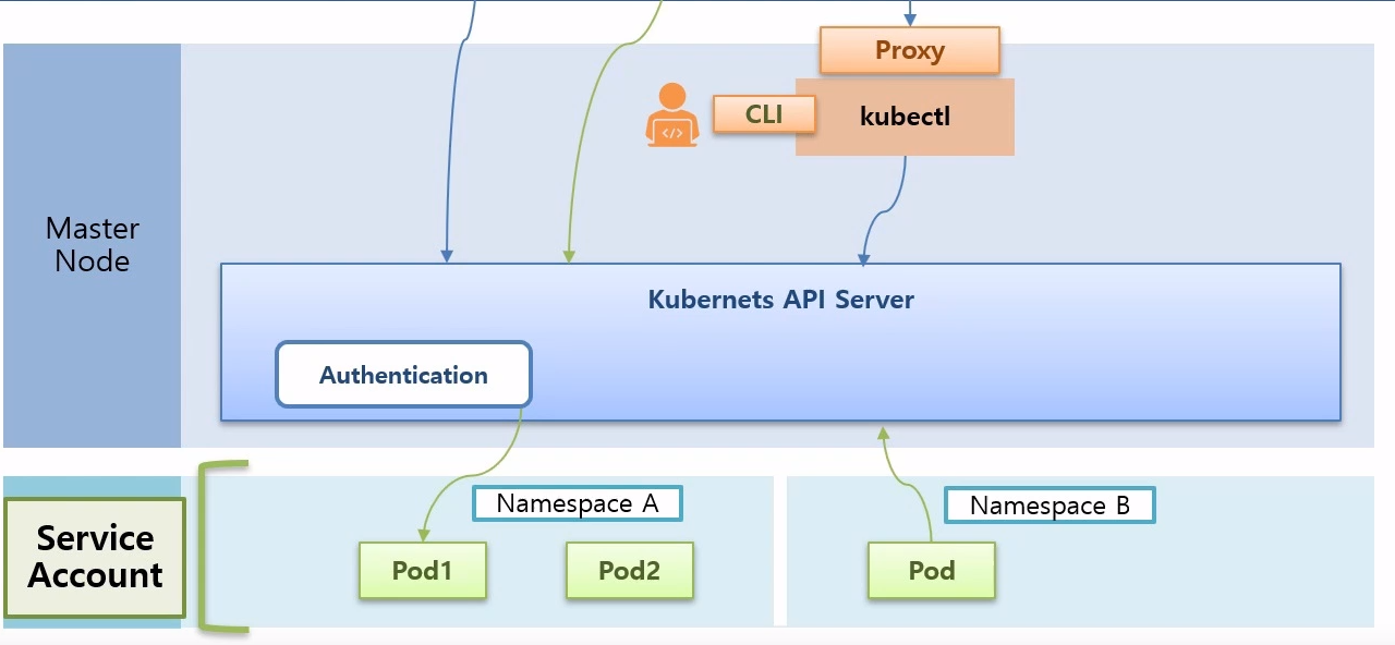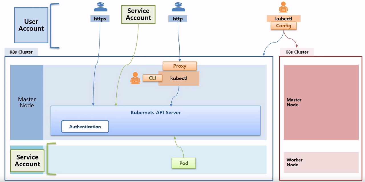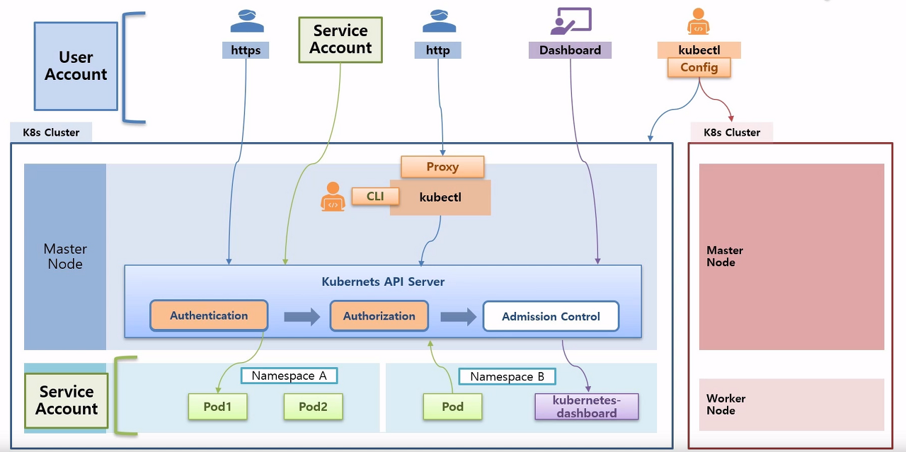 - 결국 쿠버네티스는 User Account와 Service Account로 사용자, 파드가 Kubernetes API Server에 접근할 수 있음