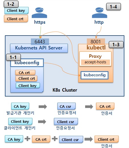 - 사용자가 https 접근을 하려면 쿠버네티스 클러스터에 kubeconfig가 있어야 함