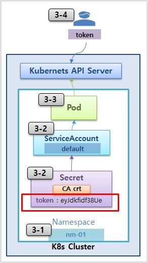 - 파드를 만들면 Service Account와 연결되고 파드는 token 값을 통해서 Kubernetes API Server와 연결 가능